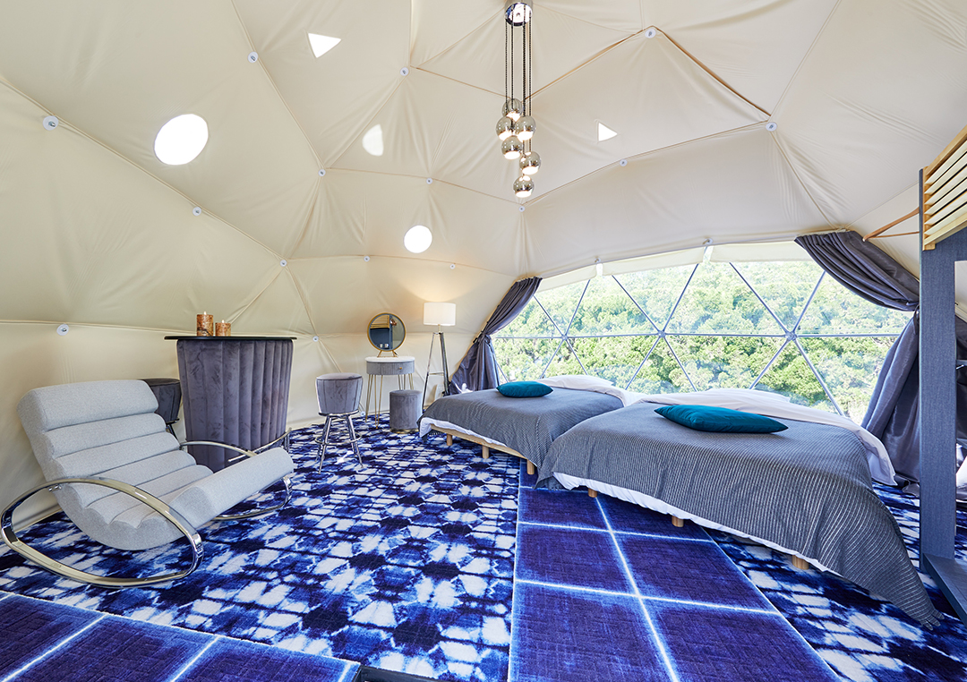 パワースポットとして有名な「星ヶ見岩」近くにある、ドーム5部屋限定のグランピング施設「星が見の杜」。自然の中に設置されたドーム状のテントには贅沢な空間が広がり、冷暖房完備で季節を問わず快適に過ごせます。