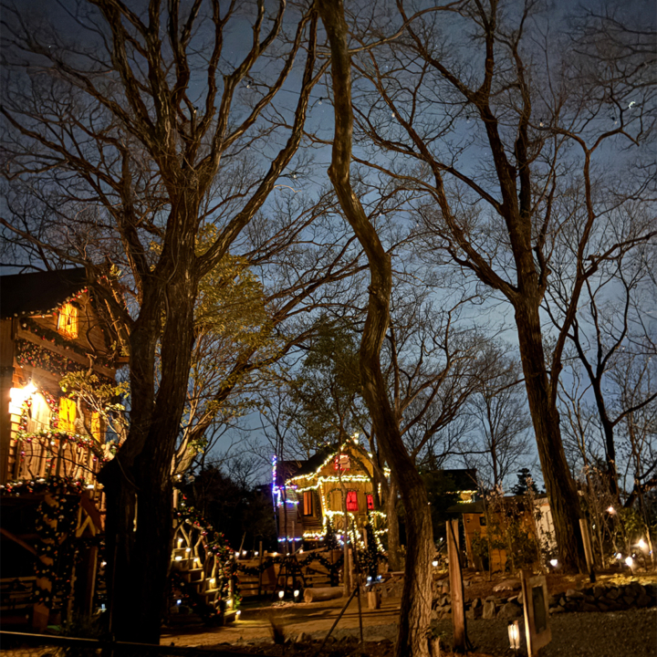 夜になるとツリーハウスがやわらかくライトアップされ、昼間とは異なる幻想的な雰囲気に。