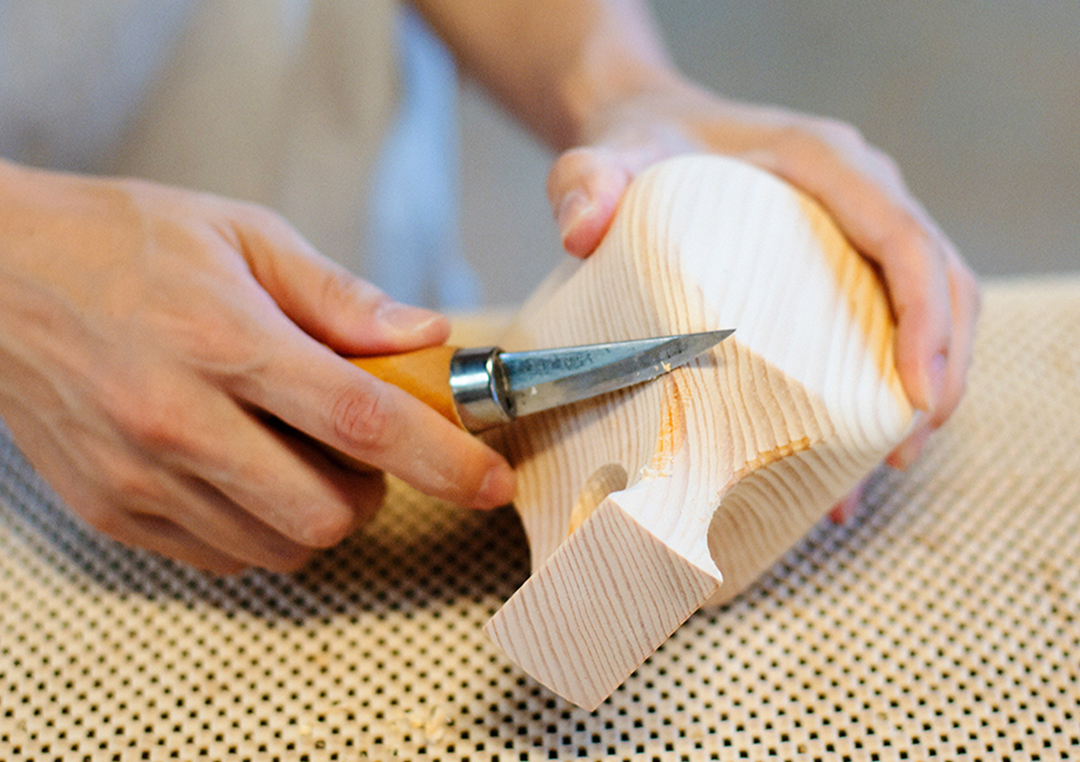 角ばったところを、モーラナイフで削ります。向きによって、削りやすかったり、刃がスムーズに進まなかったり。「木目に沿うようにして削るといいですよ」と鈴木さん。