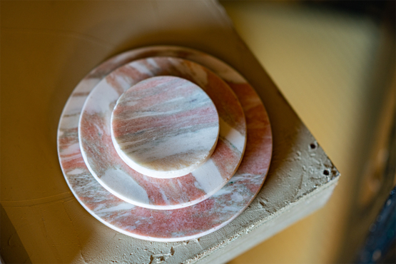 同じくデザイン室で働く岸弘子さんが手がけるのは「miranda」シリーズ。これは、架空に存在する金髪のミランダという女性が使う皿をイメージして作ったのだとか。「flat」に比べると、少し厚みを感じるつくりに安定感も。このシリーズのこだわりは、一般的なサイズ展開よりも少し大きくつくっていること。どうやら、1番小さいサイズは、ショートケーキが映えるサイズ。一番大きい皿は、クレープを焼いたときに、ちょうどペロンとそのままラフに置けるサイズということ。スイーツを基準にしているあたり、何とも女性らしいですね!